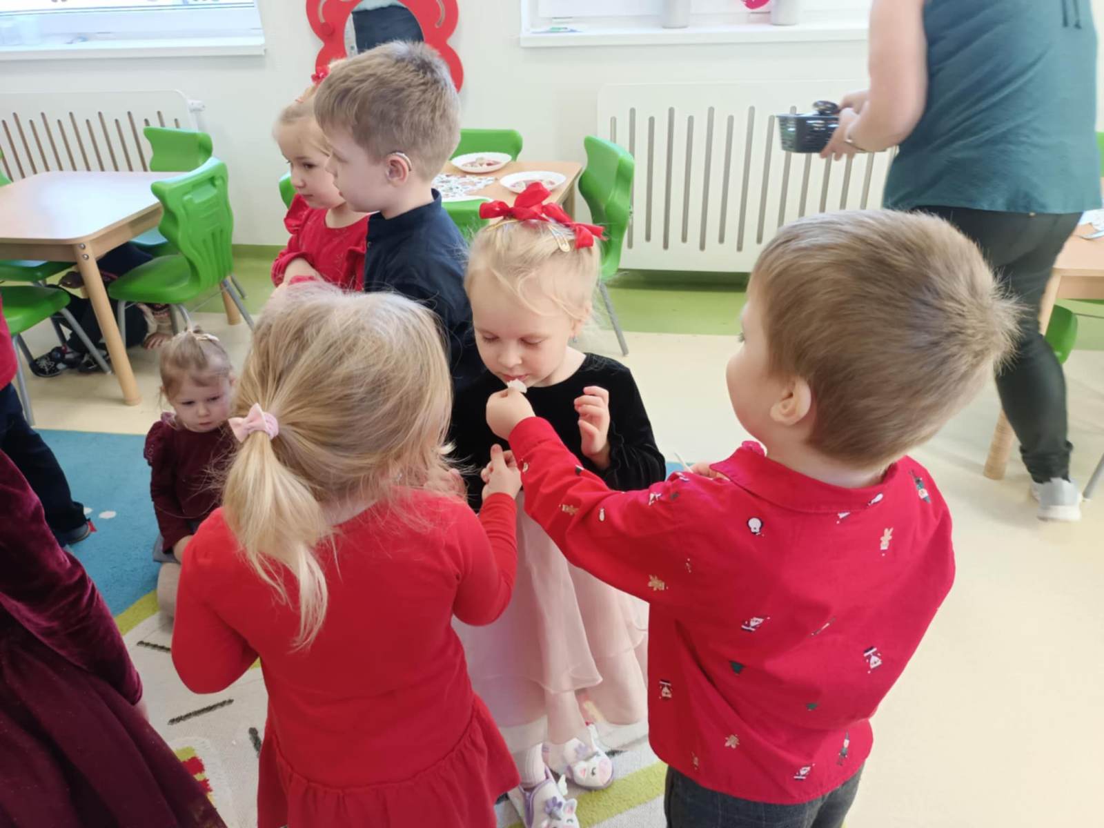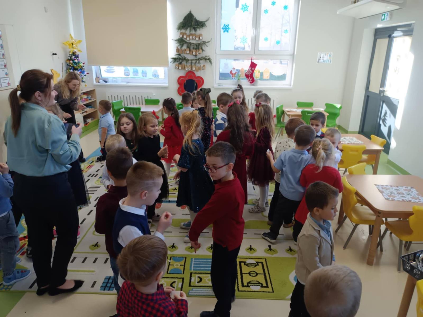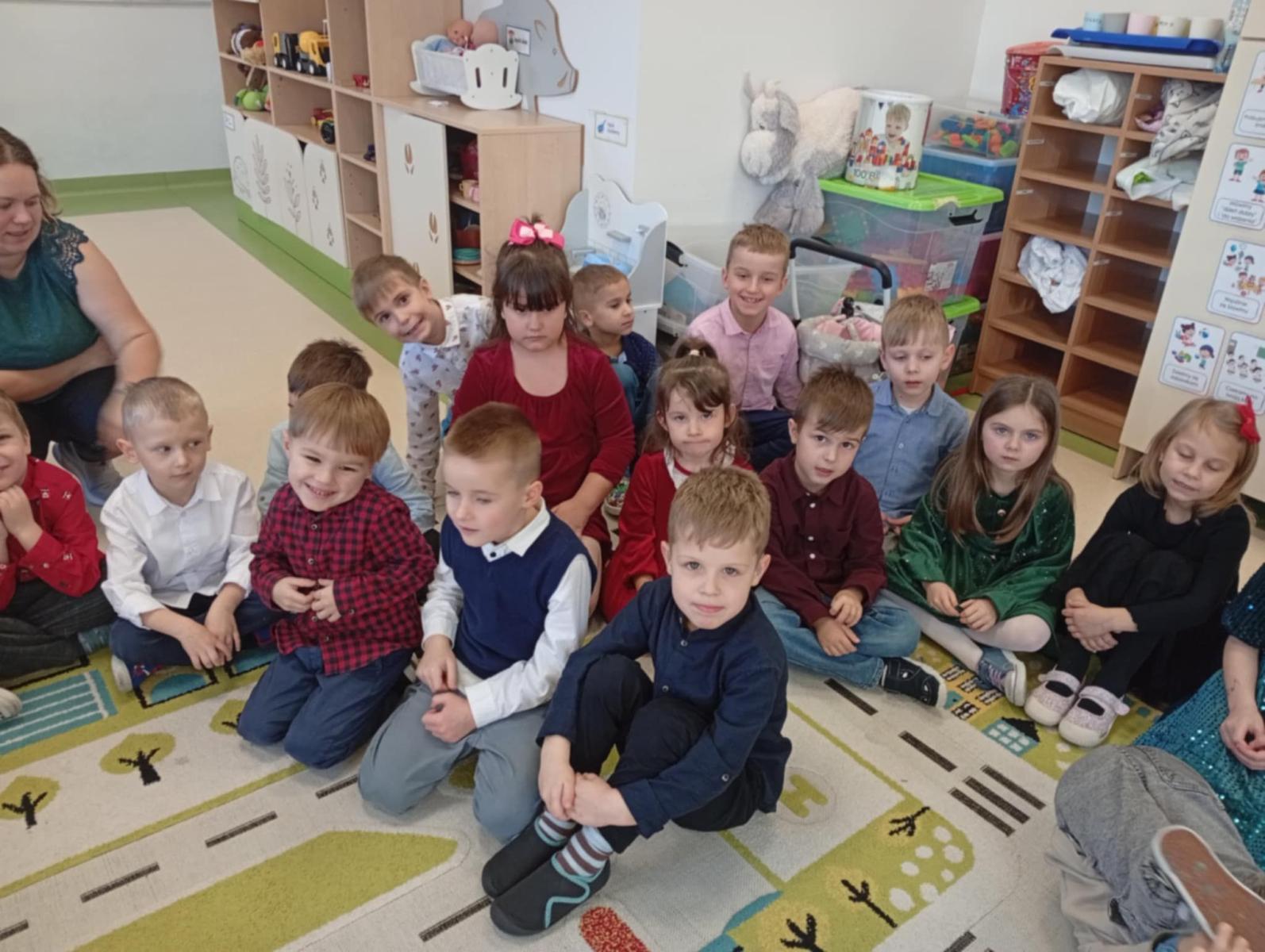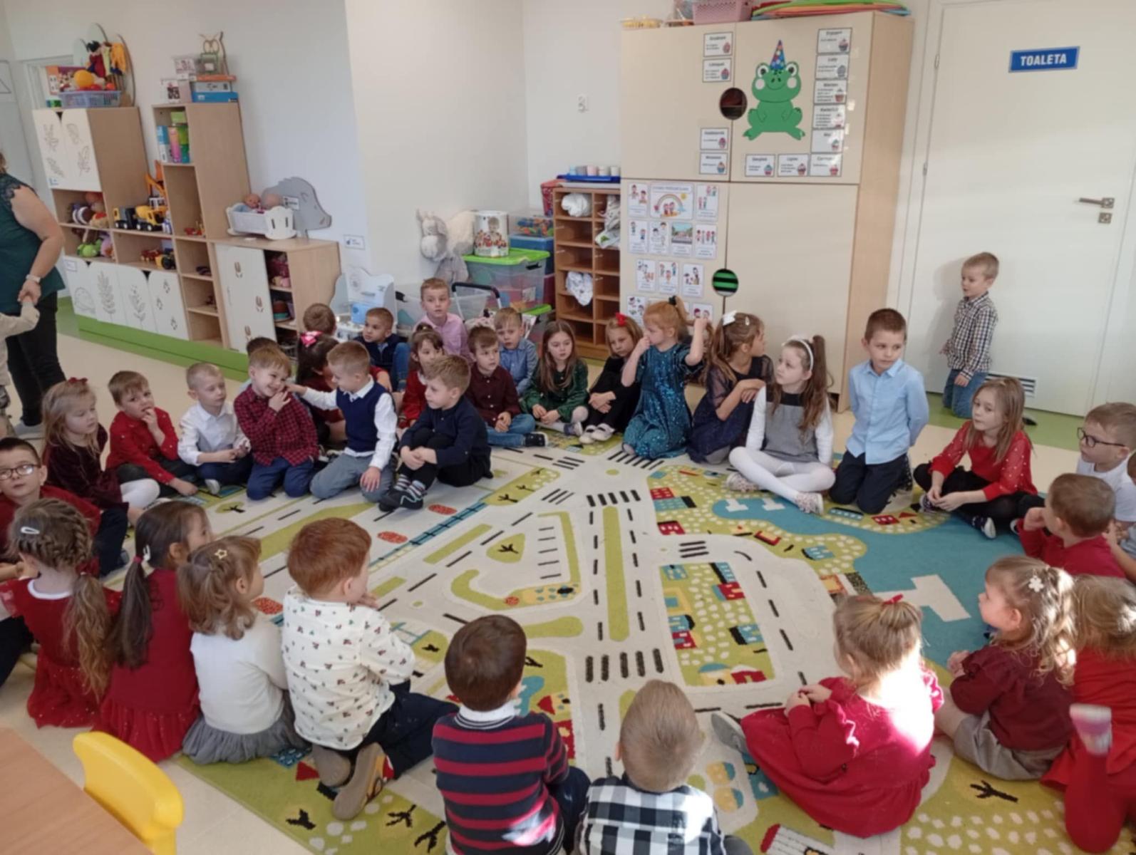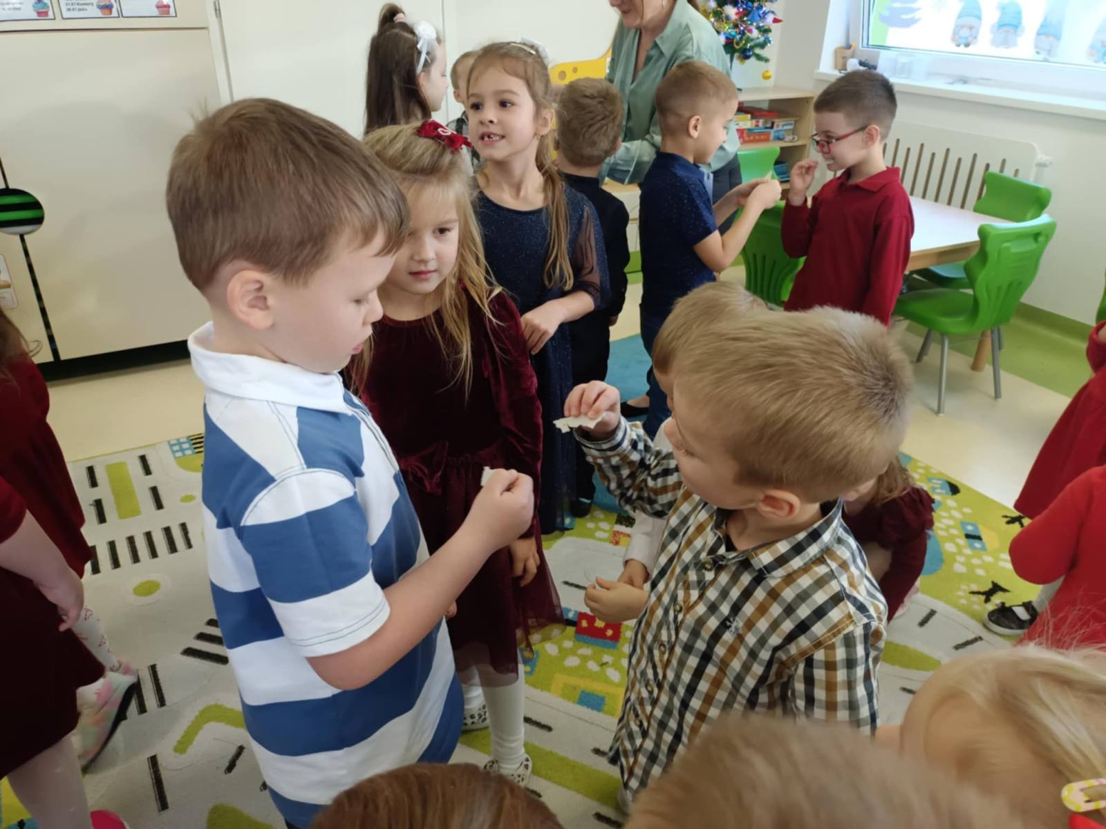 W ten piękny, jeszcze przedświąteczny czas, zgodnie z podtrzymywaną co roku tradycją, w naszym przedszkolu odbyło się spotkanie wigilijne. Wszyscy zebraliśmy się w świątecznie udekorowanej sali, w której kolorowo zabłysnęła ubrana przez nas choinka. Na początek wspólnie z ogromną radością śpiewaliśmy kolędy.