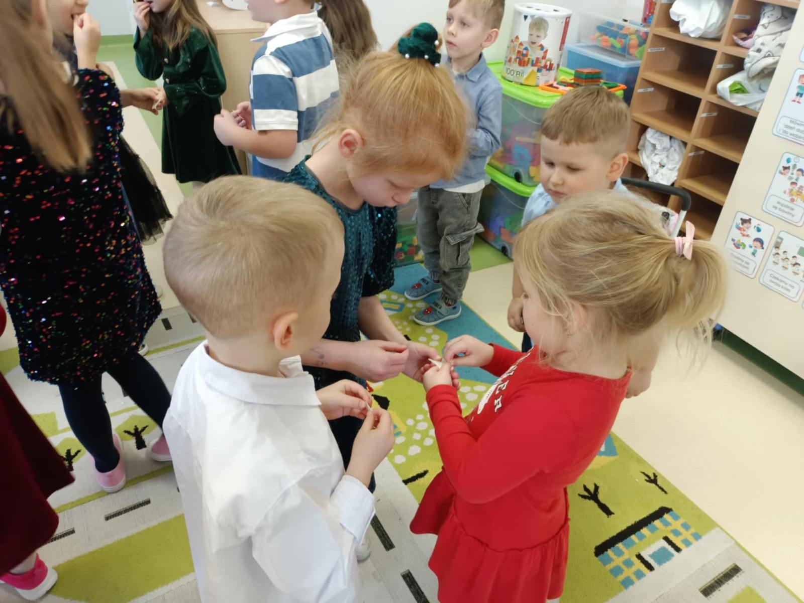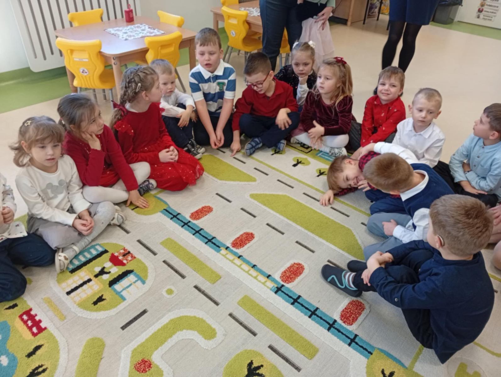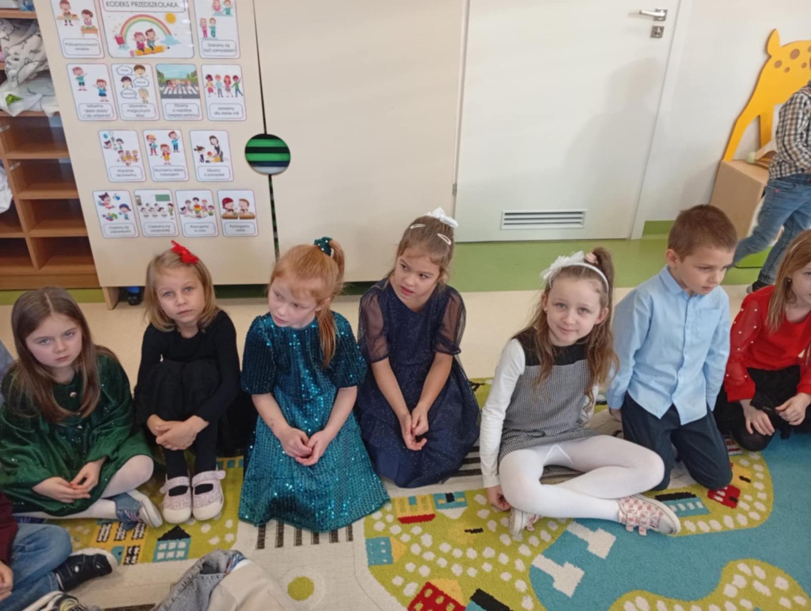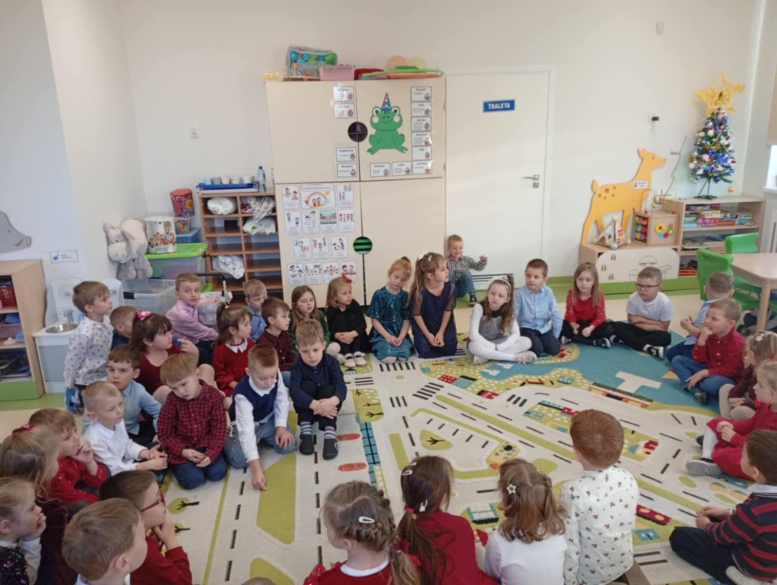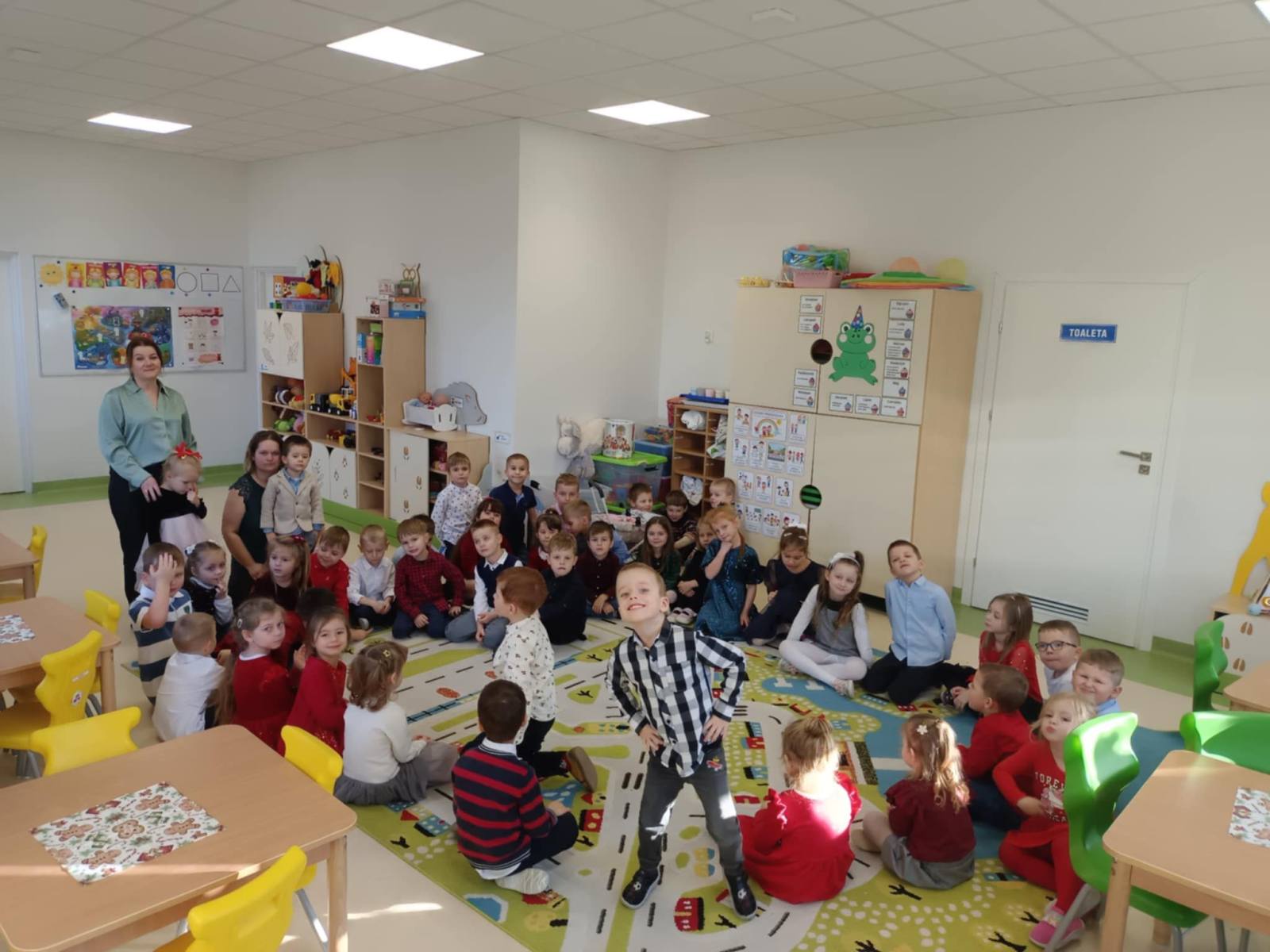 W ten piękny, jeszcze przedświąteczny czas, zgodnie z podtrzymywaną co roku tradycją, w naszym przedszkolu odbyło się spotkanie wigilijne. Wszyscy zebraliśmy się w świątecznie udekorowanej sali, w której kolorowo zabłysnęła ubrana przez nas choinka. Na początek wspólnie z ogromną radością śpiewaliśmy kolędy.