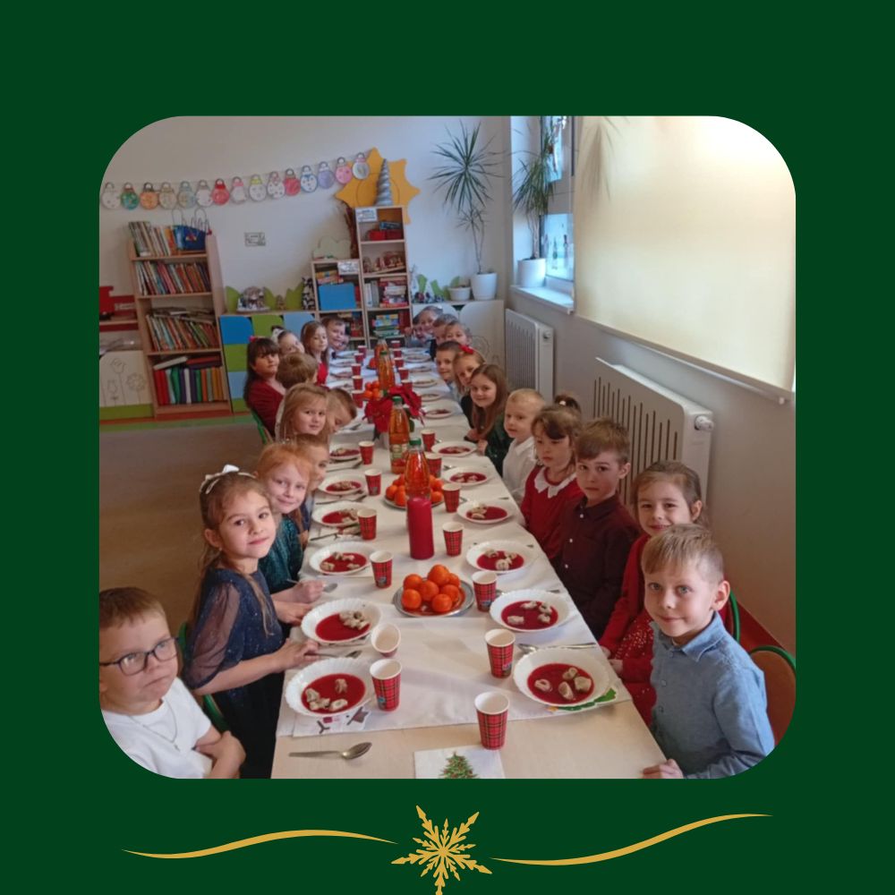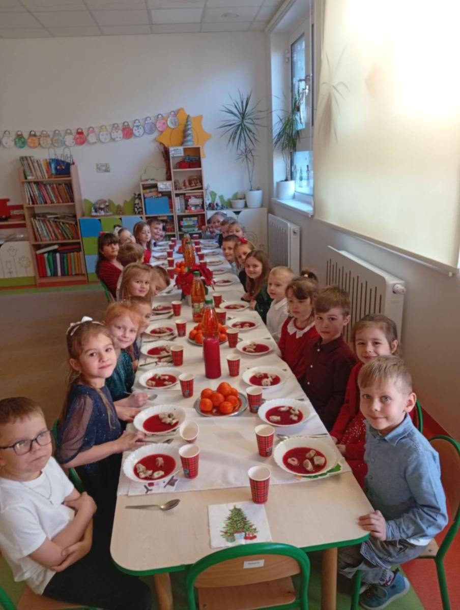 Po kolędowaniu każdy z nas otrzymał opłatek i rozpoczęło się składanie życzeń. Był to niezwykły moment, który zapamiętamy na bardzo długo. I wreszcie nadszedł czas wspólnego posiłku. Nie obyło się również bez słodkości.