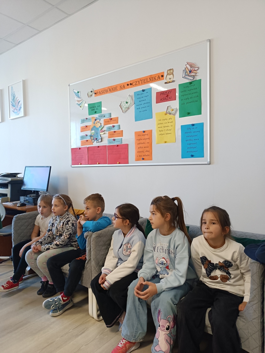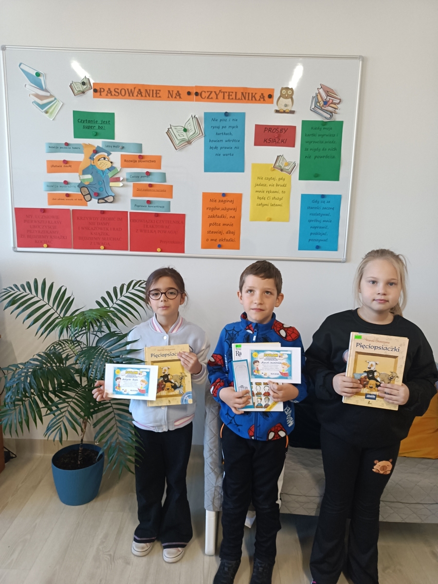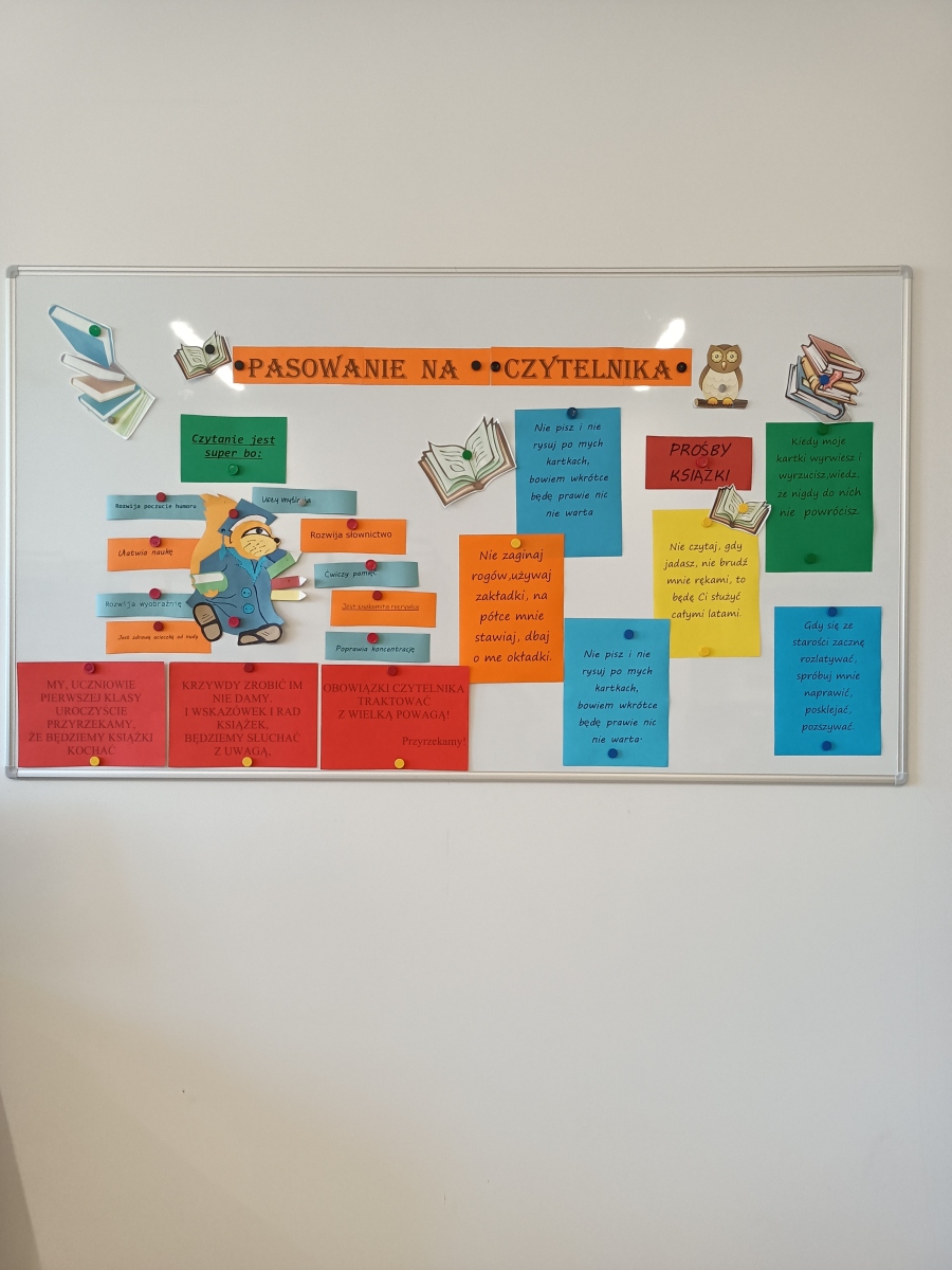 19 listopada uczniowie klasy I zostali czytelnikami szkolnej biblioteki. Wykazali się znajomością bajek i baśni, poprawnie rozwiązali zagadki i łamigłówki a KSIĄŻCE ślubowali, że będą ją szanować, wypożyczać a co najważniejsze – CZYTAĆ.