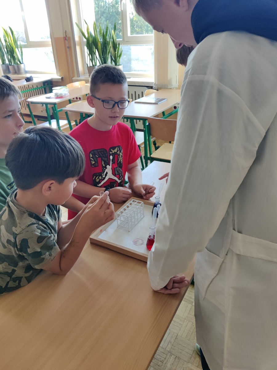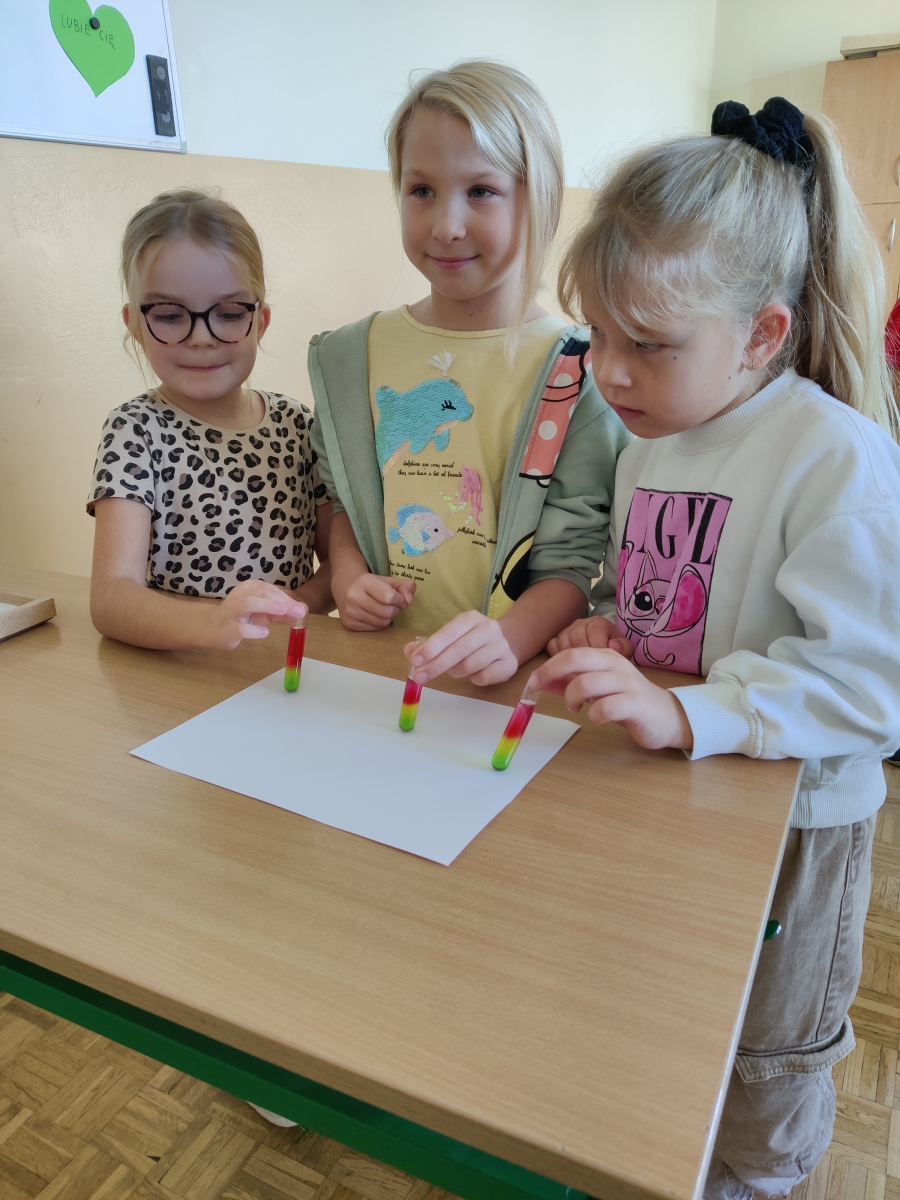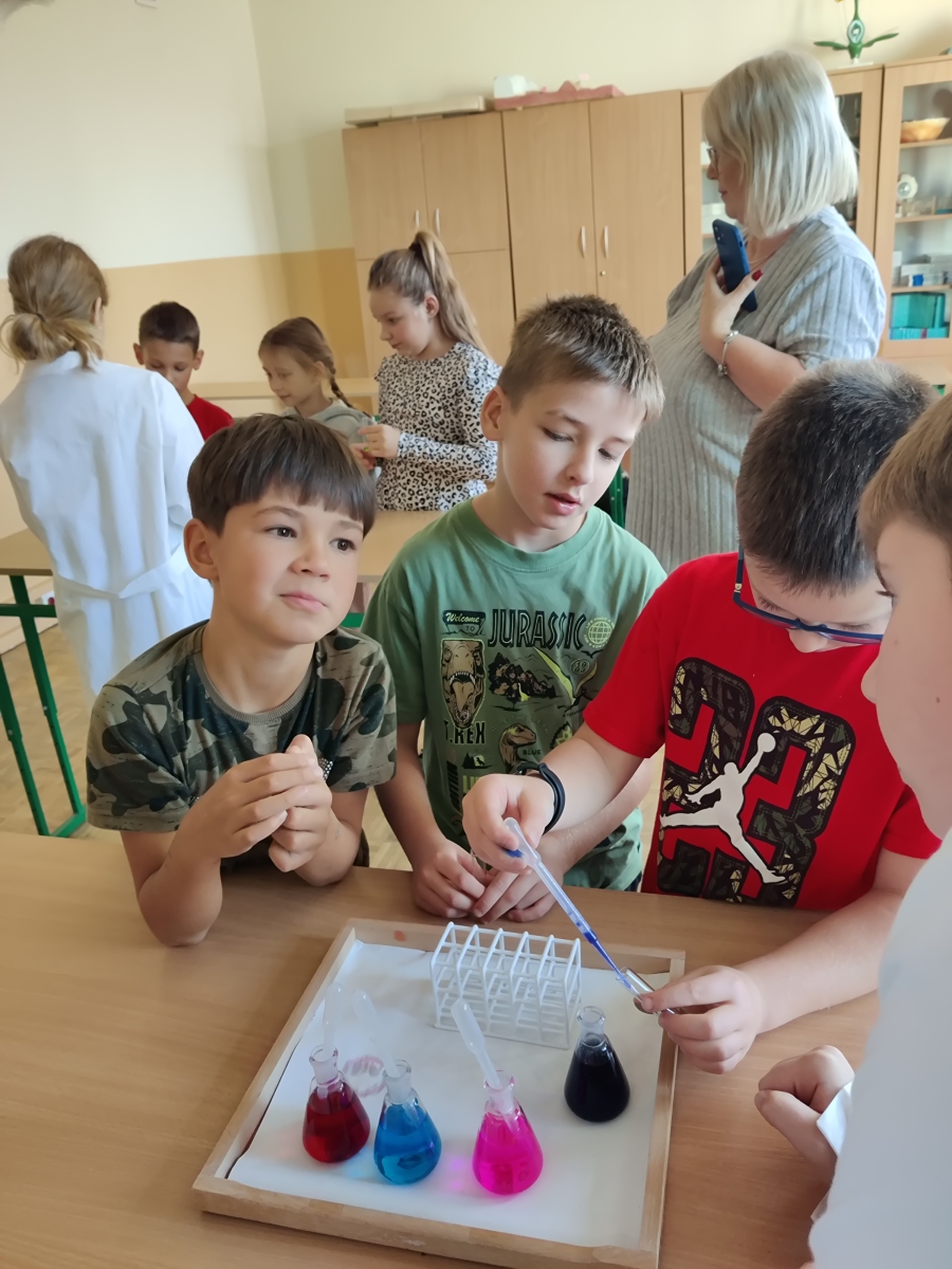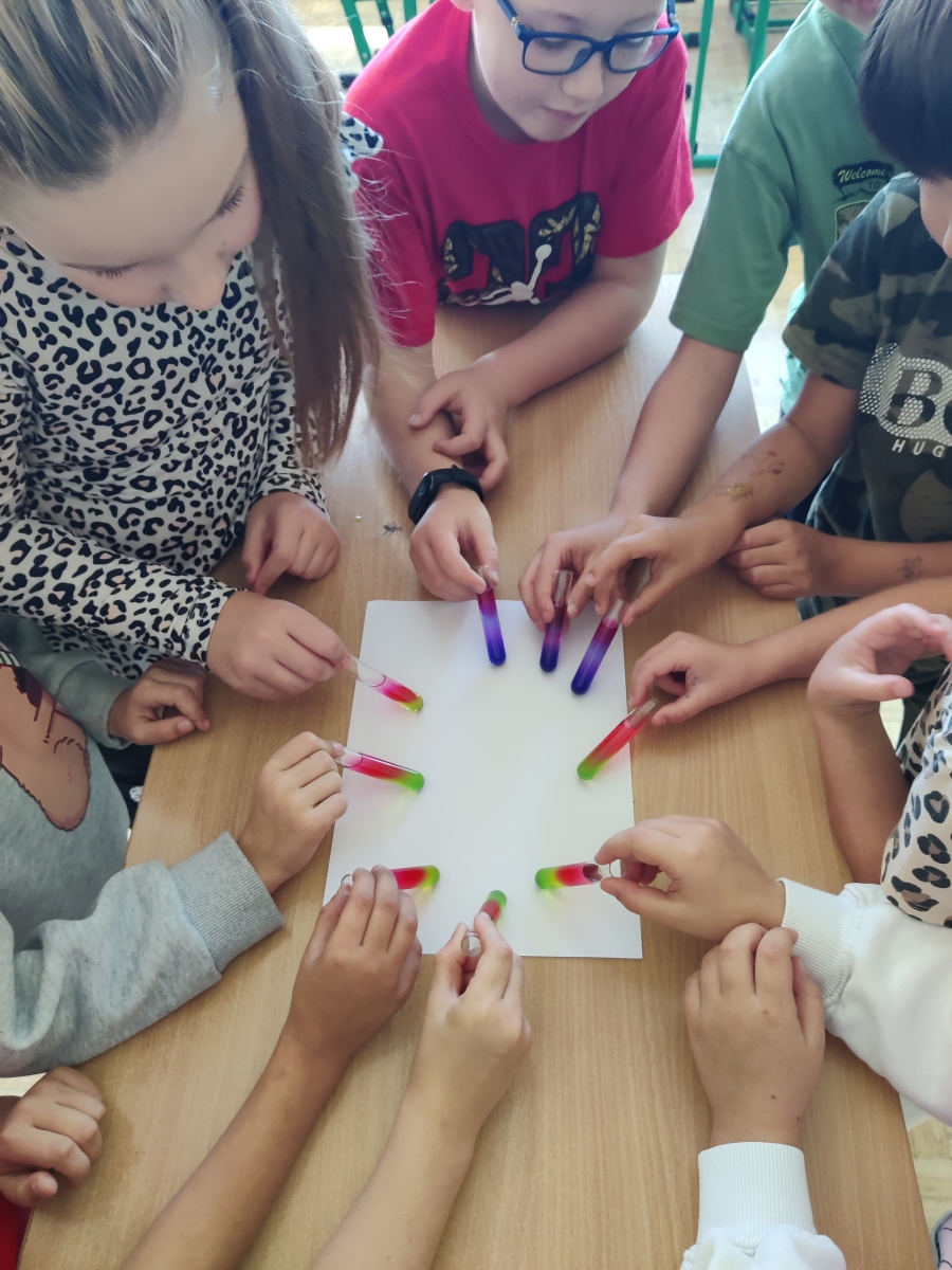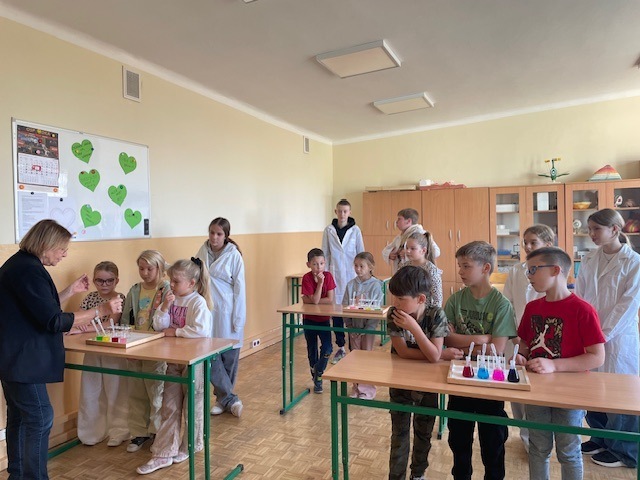 Dziś uczniowie klasy drugiej wcielili się w rolę młodych naukowców i samodzielnie stworzyli tęczę w probówce! Eksperyment oparty na różnicach gęstości kolorowych roztworów dostarczył im mnóstwo radości i satysfakcji. W przygotowaniach pomagali uczniowie klasy siódmej, którzy zadbali o odczynniki i sprzęt laboratoryjny. Całość przebiegła pod opieką nauczycielki chemii. Była to kolorowa lekcja nauki, współpracy i dobrej zabawy!