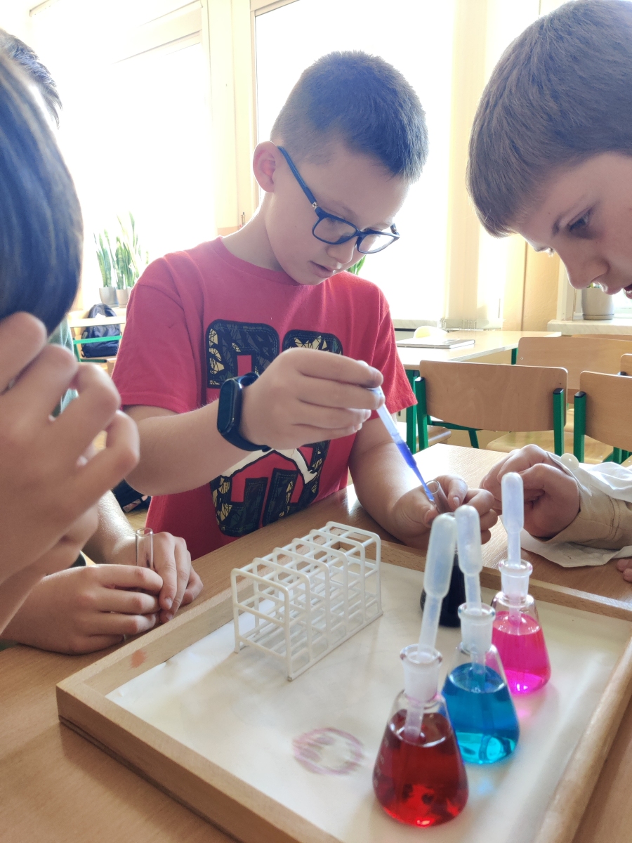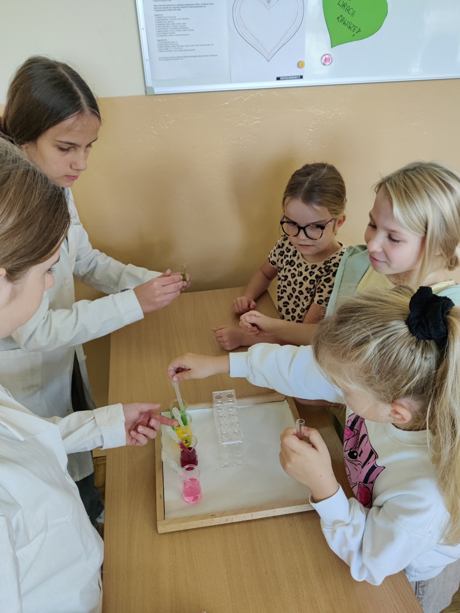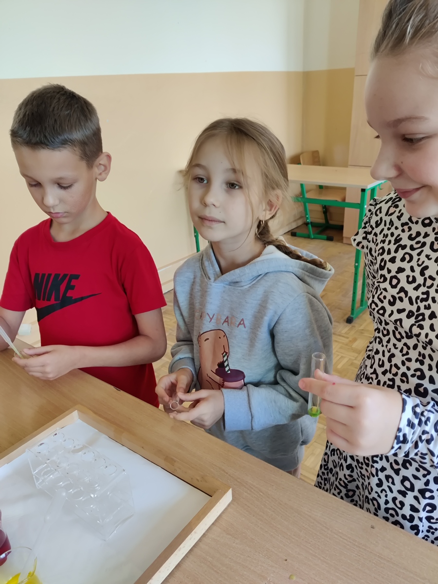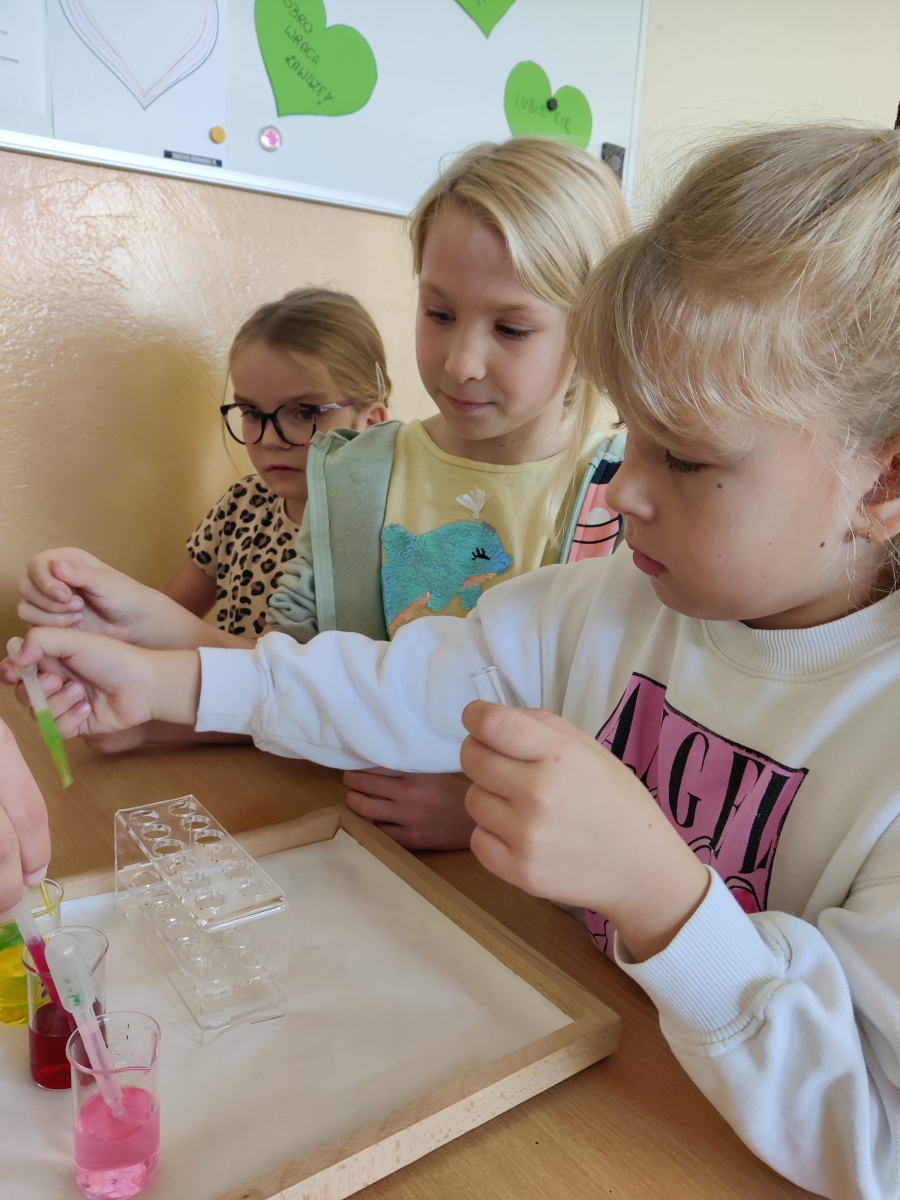 Dziś uczniowie klasy drugiej wcielili się w rolę młodych naukowców i samodzielnie stworzyli tęczę w probówce! Eksperyment oparty na różnicach gęstości kolorowych roztworów dostarczył im mnóstwo radości i satysfakcji. W przygotowaniach pomagali uczniowie klasy siódmej, którzy zadbali o odczynniki i sprzęt laboratoryjny. Całość przebiegła pod opieką nauczycielki chemii. Była to kolorowa lekcja nauki, współpracy i dobrej zabawy!