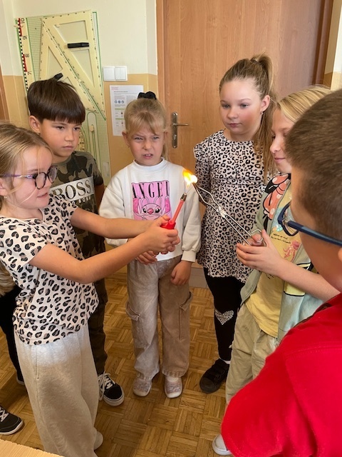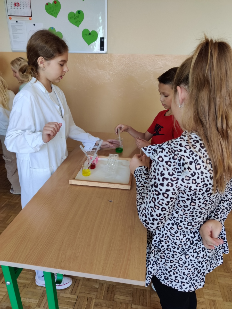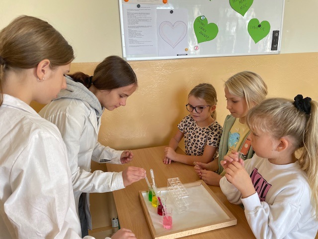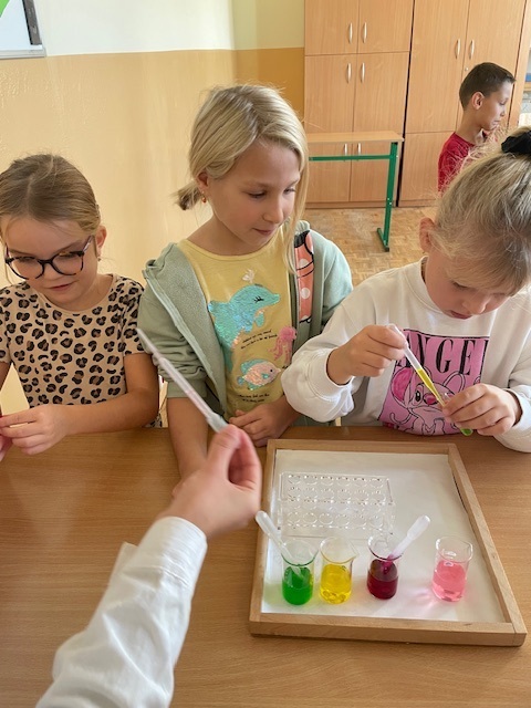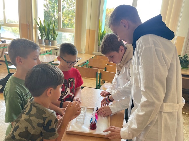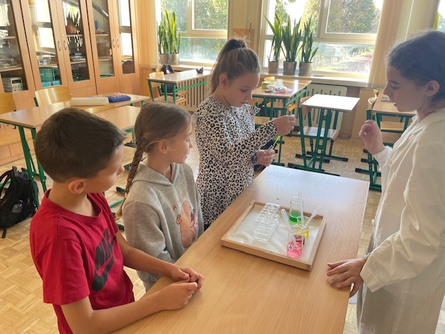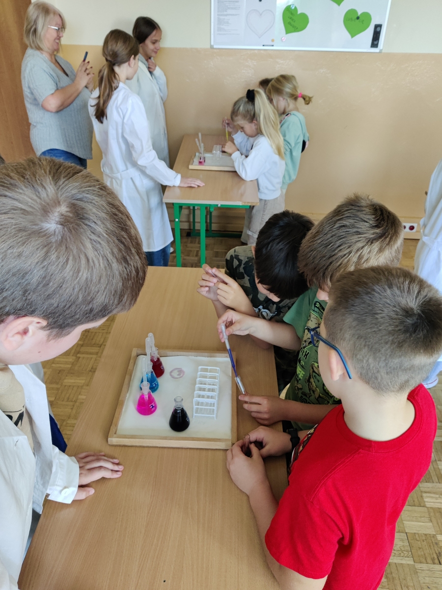 Dziś uczniowie klasy drugiej wcielili się w rolę młodych naukowców i samodzielnie stworzyli tęczę w probówce! Eksperyment oparty na różnicach gęstości kolorowych roztworów dostarczył im mnóstwo radości i satysfakcji. W przygotowaniach pomagali uczniowie klasy siódmej, którzy zadbali o odczynniki i sprzęt laboratoryjny. Całość przebiegła pod opieką nauczycielki chemii. Była to kolorowa lekcja nauki, współpracy i dobrej zabawy!